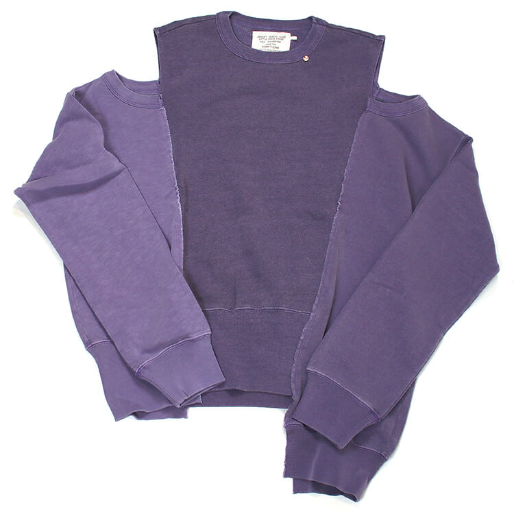 【2025年 秋冬新作商品】柔らかいコットン裏毛素材使用のスウェット。肌触りも良く、着心地バツグン。23AWシーズンにて大人気だったデザインの復刻です!肩見せしたり、ノースリーブにして袖を結んだり、いろいろな着こなしが楽しめます。クルーネックのスウェットを3枚リメイクしてドッキングさせたデザイン。今シーズンは経年変化を楽しんでいただける方法で染めています。大人サイズのみ。                          ★クロネコゆうパケット指定不可