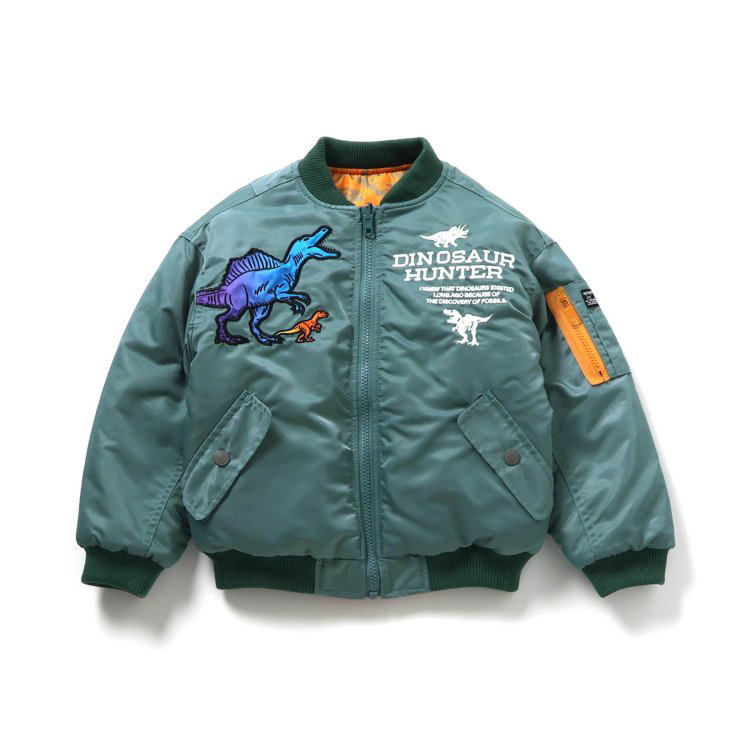 【ブランド:BREEZE】【2025年 秋新作商品】ナイロンツイル素材使用のブルゾン。アウターとしての機能性はもちろん、コーデの格が上がるおしゃれデザイン。インパクトある恐竜のデザインがポイント。ベビー・キッズサイズのみ。             ★クロネコゆうパケット指定不可