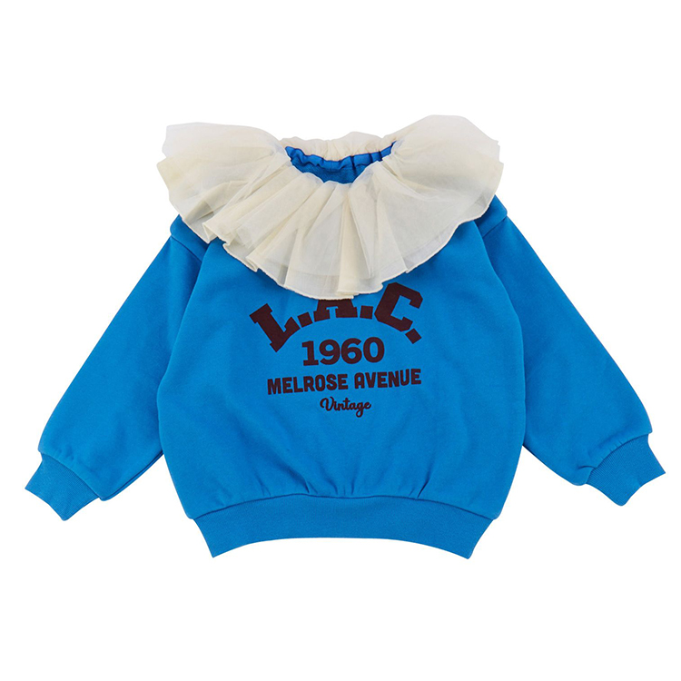 【2025年 秋冬新作商品】柔らかいコットン素材使用のスウェット。肌触りも良く、着心地バツグン。ボリュームフリルカラーがポイント。ゴムで伸びる衿ぐりの仕様なので着用も簡単。ゆるっとしたBIGシルエット。ベビー・キッズサイズのみ。        ★クロネコゆうパケット指定不可