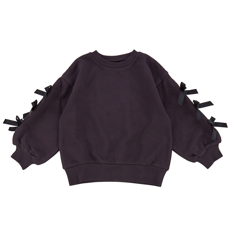 【2025年 秋冬新作商品】柔らかいコットン素材使用のスウェット。肌触りも良く、着心地バツグン。袖にあしらったリボンディティールがガーリーなデザイン。程よいボリュームスリーブにモノトーンカラーのサテンリボンが大人可愛い。肩落ちのたっぷりとしたシルエット。ベビー・キッズサイズのみ。           ★クロネコゆうパケット指定不可