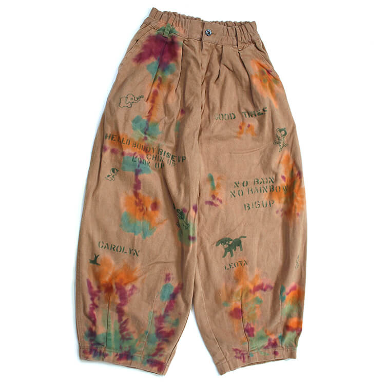 【2025年 秋冬新作商品】裏起毛素材使用のバルーンパンツ。肌触りも良く、履き心地バツグンの暖か仕立て。D.Dらしいカラフルなムラ染めが可愛い!ステンシルとムラ染めの対比が可愛く存在感バツグン!ウエストフロントは、ボタン式・ゴム入り。ゆるっとしたバルーンシルエットもポイント。大人サイズのみ。       ★クロネコゆうパケット指定不可