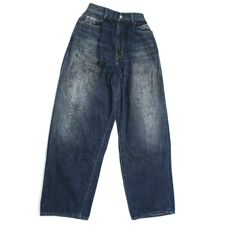 【2025年 秋冬新作商品】D.D定番の12ozセルビッチデニムを基に、中空ナイロン糸を緯糸に使用したオリジナル素材のパンツ。引っ張られる力に強いため洗濯においても、綿に比べ劣化が少なく長く安心して使えるのが特徴。前にタックを入れて太めのシルエットがとても可愛い。前に薄っすら落書きが入っていて裾を折り返すとセルビッチが見えて圧倒的な存在感。大人サイズのみ。     ★クロネコゆうパケット指定不可