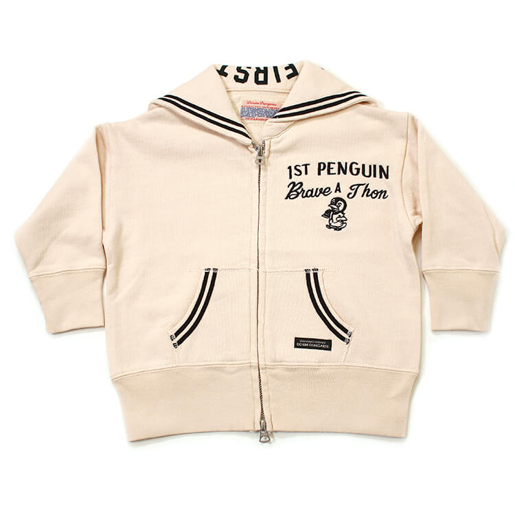 【2025年 秋冬新作商品】柔らかいコットン裏毛素材使用のジップアップパーカー。肌触りも良く、着心地バツグン。セーラー衿がポイント。D.Dで長く展開している「ファーストペンギン」シリーズ。ファーストペンギンの様に、誰かの後ろを付いていくのではなく自ら道を切り開いてほしいというメッセージが込められたアイテム。お子様から大人の皆様まで。               ★クロネコゆうパケット指定不可
