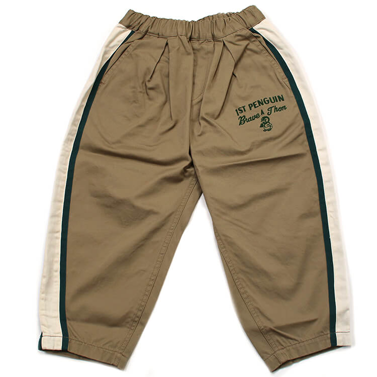 【2025年 秋冬新作商品】目の細かい丈夫なチノ素材使用のパンツ。肌触りも良く、履き心地バツグン。ベースボールパンツ風に両サイドに配色の切り替えを足したリメイクデザイン。フロントの定番人気のペンギンちゃんがポイントの一つ。ウエストフロントは、全ゴム仕様。お子様から大人の皆様まで。           ★クロネコゆうパケット指定不可