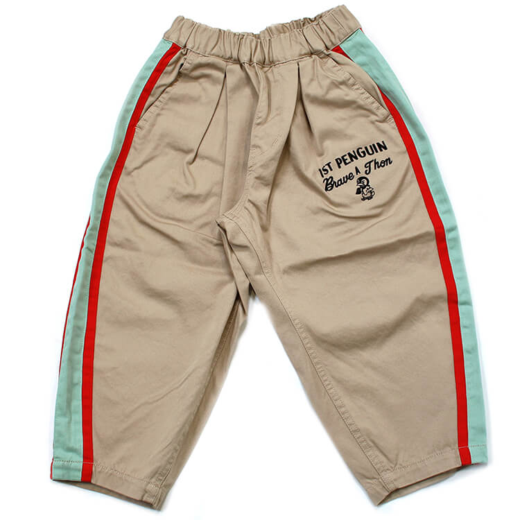 【2025年 秋冬新作商品】目の細かい丈夫なチノ素材使用のパンツ。肌触りも良く、履き心地バツグン。ベースボールパンツ風に両サイドに配色の切り替えを足したリメイクデザイン。フロントの定番人気のペンギンちゃんがポイントの一つ。ウエストフロントは、全ゴム仕様。お子様から大人の皆様まで。           ★クロネコゆうパケット指定不可