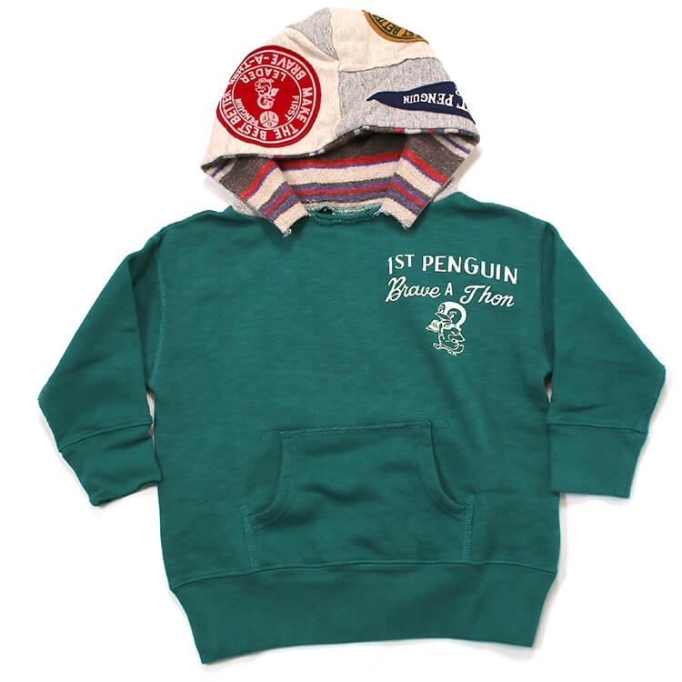 【2025年 秋冬新作商品】トンプキン編み機で編み立てられた柔らかいコットン裏毛素材のパーカー。肌触りも良く、着心地バツグン。フード部分は、いろんな生地が組み合わさっており、裏側はボーダーデザイン。定番のペンギンちゃんもポイントの一つ。お子様から大人の皆様まで。                    ★クロネコゆうパケット指定不可