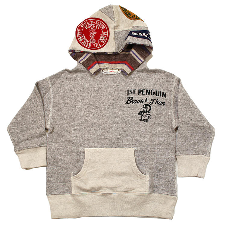 【2025年 秋冬新作商品】トンプキン編み機で編み立てられた柔らかいコットン裏毛素材のパーカー。肌触りも良く、着心地バツグン。フード部分は、いろんな生地が組み合わさっており、裏側はボーダーデザイン。定番のペンギンちゃんもポイントの一つ。お子様から大人の皆様まで。                    ★クロネコゆうパケット指定不可