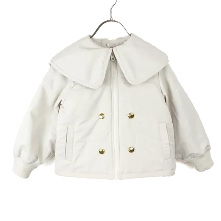 【2025年 秋冬新作商品】上品な光沢感とハリのある素材のセーラー衿の中綿ジャケット。身頃裏はフリース素材であったか仕立て。袖裏は袖通りが良いポリエステルタフタ素材です。衿は取り外し可能で、裏表リバーシブルに付け替えも可能。身頃と同色衿でシックに、配色衿で印象的に。コーデに合わせた着こなしが楽しめます。ベビーサイズからジュニアサイズまで。            ★クロネコゆうパケット指定不可