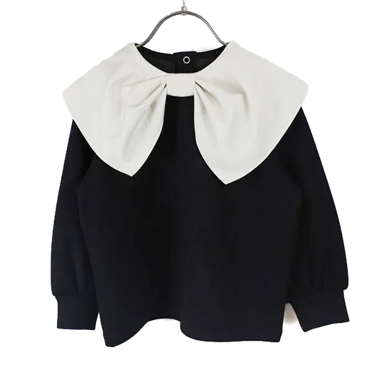 【2025年 秋冬新作商品】キレイめなダンボールニット素材使用のトレーナー。肌触りも良く、着心地バツグン。オフカラーの大きなリボン衿がおしゃれ!これ1枚をコーデに加えていただくだけで印象的なスタイリングに◎。ベビーサイズからジュニアサイズまで。★クロネコゆうパケット指定不可