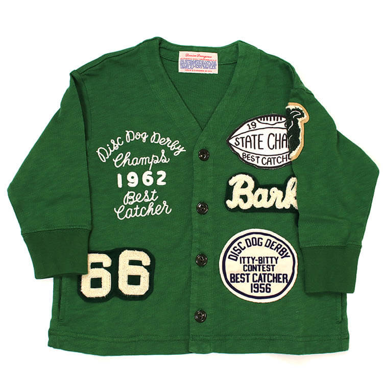 【2026年 春夏新作商品】柔らか天竺素材使用のカーディガン。肌触りも良く、着心地バツグン。ヴィンテージライクなワッペン使いが目を引きます。インパクド大!架空のディスクドック大会をモチーフにしたワッペンや刺しゅうがポイント。キッズ・大人サイズのみ。★クロネコゆうパケット指定不可