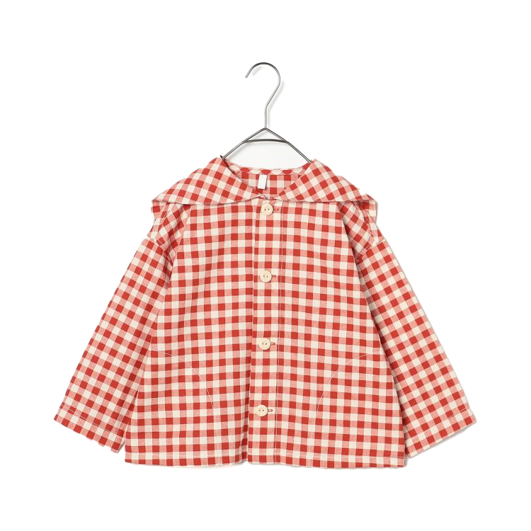 【ブランド:p.premier】【2026年 春新作商品】綿100%の先染めギンガムチェックシャツ。昨年大好評だったシャツジャケットが、今年は大きいセーラーカラーデザインになって登場です。1枚でシャツとしても、前を開けて羽織としても着用いただけます。キッズサイズのみ。                      ★クロネコゆうパケット指定不可