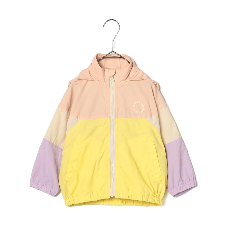 【ブランド:p.premier】【2026年 春新作商品】タフタワッシャー素材使用のウィンドブレーカー。雨が降っても濡れにくい撥水加工やメッシュ素材の裏地で通気性が良いのもポイント。春らしい色使いのマルチカラー切り替えデザイン。保育園などでも安心のフードがしまえる仕様。ベビー・キッズサイズのみ。        ★クロネコゆうパケット指定不可