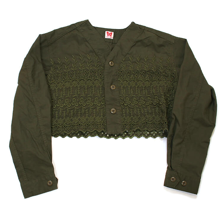 【2026年 春夏新作商品】ジャングルファティーグをリメイクしたショート丈ジャケット。ミリタリーのタフなリップストップにスカラップ刺しゅうをのせたデザイン。いい塩梅なコントラストに心がときめきます。大人サイズのみ。               ★クロネコゆうパケット指定不可