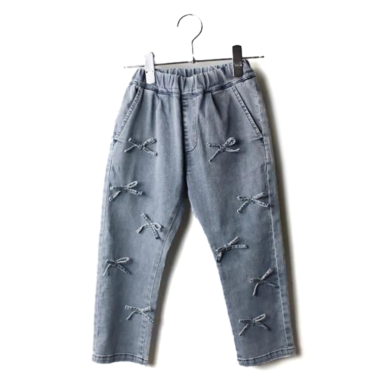 【2026年 春夏新作商品】暑い季節にぴったりな接触冷感素材使用のパンツ。柔らかく履き心地もバツグン。スッキリとしたラインで、前面にたくさんついたリボンがとっても可愛い。ウエストフロントは、ゴム仕様。ハイブリーチ加工もポイントの一つ。キッズ・ジュニアサイズのみ。                    ★クロネコゆうパケット指定不可