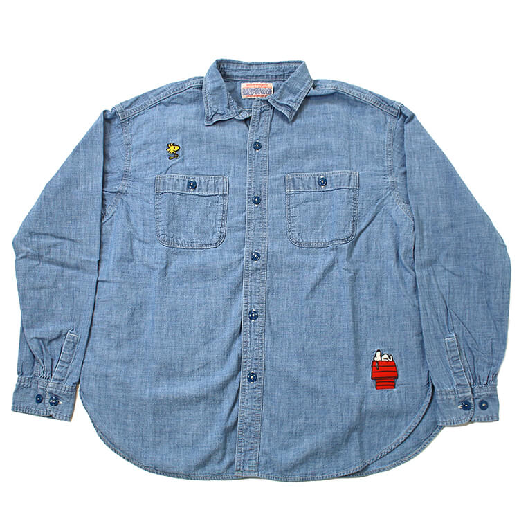 【2026年 春夏新作コラボ商品】DENIM DUNGAREE×SNOOPYコラボアイテム。独特のシャリ感を持つダンガリーシャツ。後ろにブランド名とPEANUTSがステンシルで入ってます。キャラクターの刺しゅうで本格的ながらもホームメイドされたような温かみがあります。大人サイズのみ。                  ★クロネコゆうパケット指定不可
