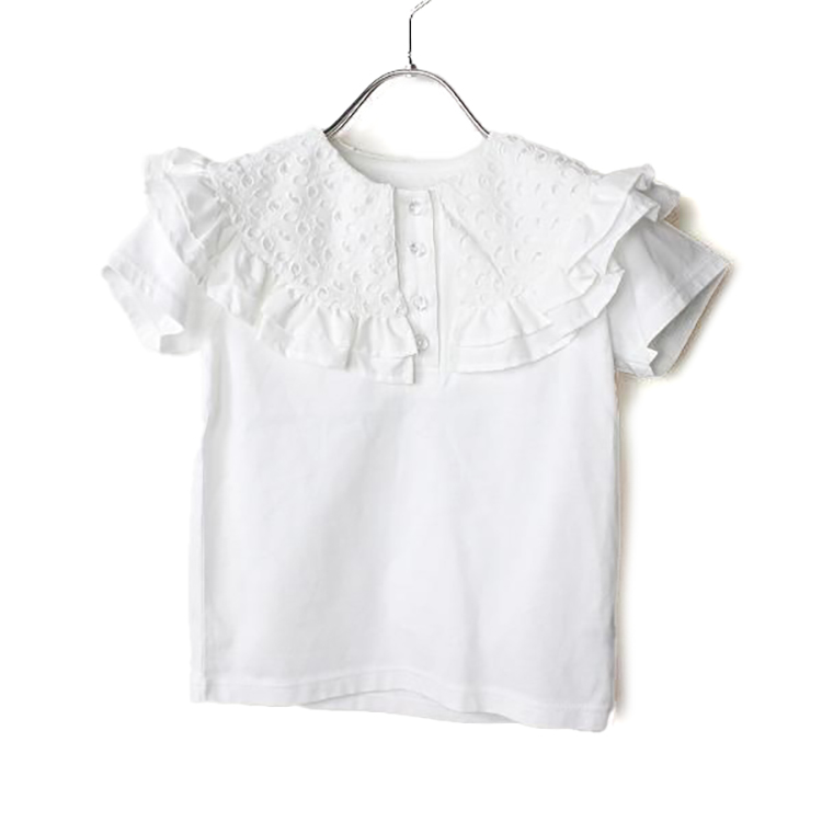 【2026年 春夏新作商品】柔らか天竺素材使用の Tシャツ。肌触りも良く、着心地バツグン。大きなレース衿が上品で印象的。カーディガンやワンピース・ジャンパースカートなどのインナーとしても重宝するアイテムです。合わせるアイテムでカジュアルからセミフォーマルまで幅広いシーンで活躍します。ベビーサイズからジュニアサイズまで。                       ★クロネコゆうパケット指定不可