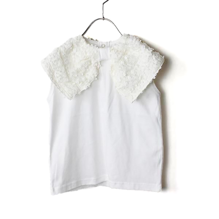 【2026年 春夏新作商品】柔らか天竺素材使用の Tシャツ。肌触りも良く、着心地バツグン。雪柳の花をちりばめた様な大きな衿が印象的。ジャンパースカートやサロペット、ワンピースのインナーにも使えるアイテムです。カジュアルなコーデに1枚プラスするだけでドレスアップした場面でも活用できます。ベビーサイズからジュニアサイズまで。                      ★クロネコゆうパケット指定不可