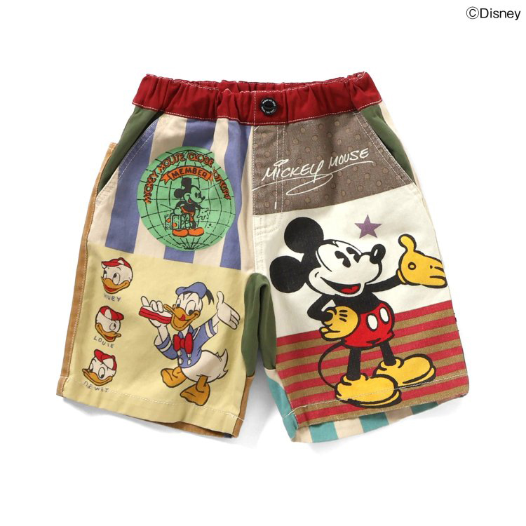 【2026年 初夏新作商品】ツイル素材のパンツ。「クラシック・ミッキー」のパッチワークデザインが目を惹きます。セピアカアラーで落ち着いた雰囲気なのに、ポップな総柄であそぼ心もたっぷり!レトロ感とポップさを両立してます。ベビーサイズからジュニアサイズまで。                         ★クロネコゆうパケット指定不可