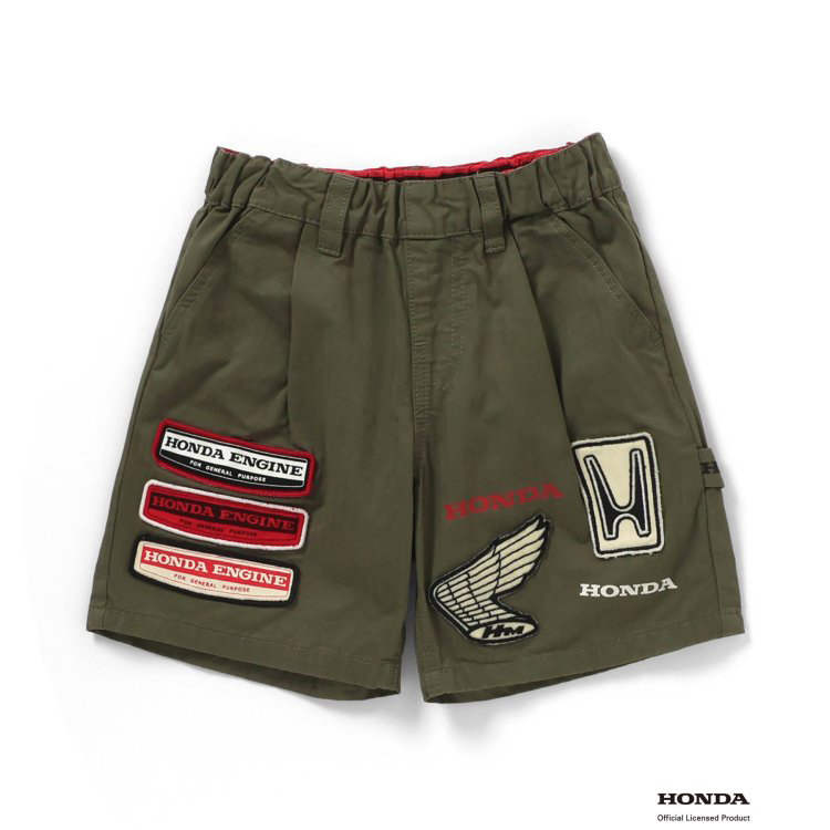 【2026年 初夏新作コラボ商品】HONDAコラボアイテム。「HONDA」のロゴワッペンを散りばめたデザイン。ハーフ丈で動きやすく、タウンユースからアウトドアまで、夏のアクティブなシーンにぴったり。車好きのお子様に是非着てほしいアイテムです。ベビーサイズからジュニアサイズまで。            ★クロネコゆうパケット指定不可