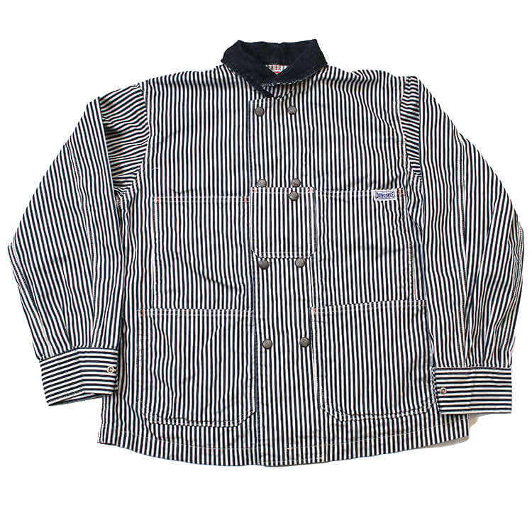 【2026年 春夏新作商品】ダブルブレスト仕様のヒッコリージャケット。1950年代の鉄道員が着ていた物を元に後に手振りミシンで刺しゅうした様な雰囲気の赤の刺しゅうがポイント。大人サイズのみ。★クロネコゆうパケット指定不可