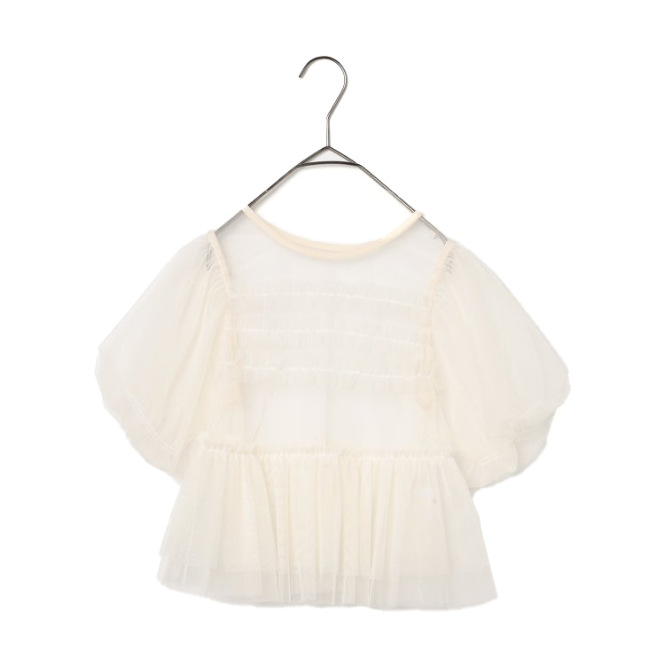 【ブランド:p.premier】【2026年 初夏新作商品】ふんわりチュールとボリュームあるパフスリーブが目をひくトップス。Tシャツやワンピースなどに重ねるだけで、コーディネートが華やかになります。ネックラインを前後同じデザインにすることで、前後どちらでも着られる2WAY仕様。ベビー・キッズサイズのみ。     ★クロネコゆうパケット指定不可