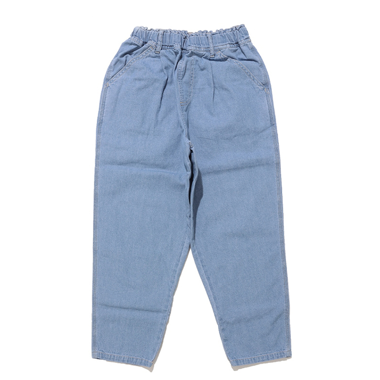 【2026年 夏新作商品】程よい厚みの6.5オンスデニムを使用し、タフさとおしゃれを兼ね備えたシェフパンツ。トリプルステッチを効かせたワークテイストのディテイールに、少しバルーン感のあるテーパードシルエットで今っぽい雰囲気に◎。ウエストフロントは、ゴム仕様。キッズ・ジュニアサイズのみ。         ★クロネコゆうパケット指定不可