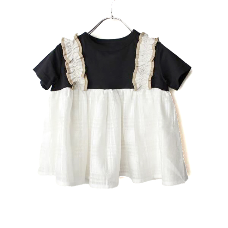 【2026年 春夏新作商品】透け感のあるシアーチェック素材のチュニックTシャツ。ボディーは着心地の良い天竺素材使用。ペプラム部分は透け感のあるシアーチェック素材ですが、裏地付きで肌が見えない様デザインされています。肩のフリルのサスペンダーが印象的。軽やかな素材感と個性的なデザインが、夏のワードロープに清涼感と華やかさを添えてくれる一着です。ベビー・キッズサイズのみ。★クロネコゆうパケット指定不可