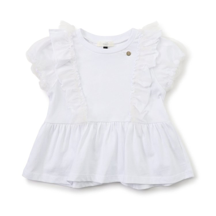 【ブランド:Seraph】【2026年 初夏新作商品】柔らか天竺素材使用のフリルTシャツ。肌触りも良く、着心地バツグン。チュールフリルが可愛いデザイン。コインタグもアクセントの一つ。ベビー・キッズサイズのみ。                   ★クロネコゆうパケット指定不可