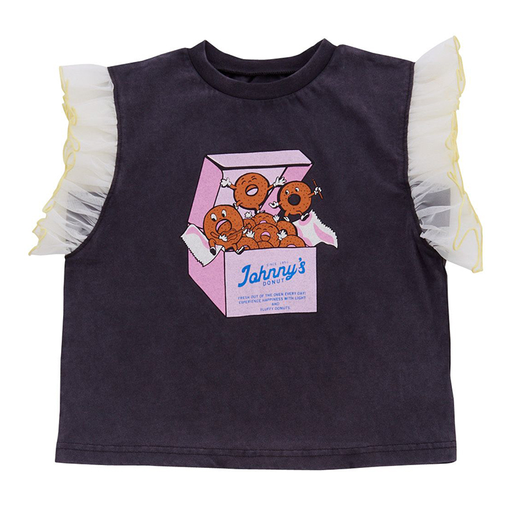 【2026年 春夏新作商品】レトロなドーナツプリントに、鮮やかなボリュームフリルをあしらったリメイクライクなTシャツ。BK、MIカラーはフェード加工を施し、ほんのりヴィンテージムードのある仕上がりに。フリル端の配色メロウがさりげないアクセント。ゆったり着られるワイドシルエット。ベビー・キッズサイズのみ。★この商品 1点のみならクロネコゆうパケット指定 OK(複数注文指定不可)