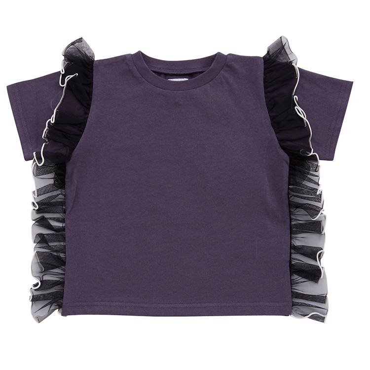 【2026年 春夏新作商品】衿ぐり〜脇に施したチュールフリルが印象的なTシャツ。肌触りの良いコットン素材使用で、着心地バツグン。フリル端のメロウカラーがアクセントに◎。トレンド感のある、程よくコンパクトなシルエット。ベビー・キッズサイズのみ。★この商品 1点のみならクロネコゆうパケット指定 OK(複数注文指定不可)