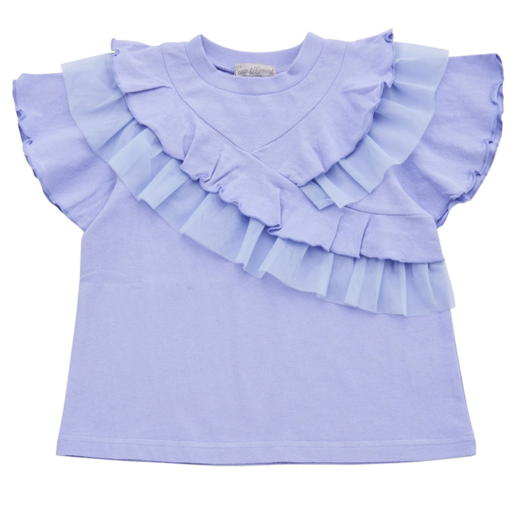 【2026年 春夏新作商品】斜めのフリルラインが特徴的なTシャツ。異素材のフリルをミックスして、立体感と奥行きのある表情に仕上げました。肌触りも良い、コットン素材使用で着心地バツグン。いつものカジュアルスタイルに、さりげない甘さをプラスしてくれます。ベビー・キッズサイズのみ。            ★この商品 1点のみならクロネコゆうパケット指定 OK(複数注文指定不可)