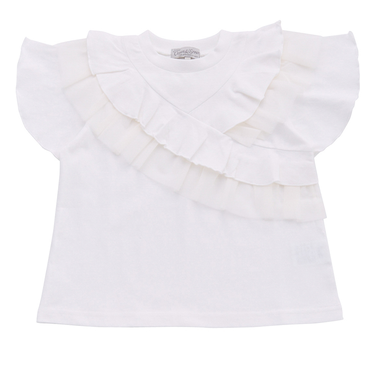 【2026年 春夏新作商品】斜めのフリルラインが特徴的なTシャツ。異素材のフリルをミックスして、立体感と奥行きのある表情に仕上げました。肌触りも良い、コットン素材使用で着心地バツグン。いつものカジュアルスタイルに、さりげない甘さをプラスしてくれます。ベビー・キッズサイズのみ。            ★この商品 1点のみならクロネコゆうパケット指定 OK(複数注文指定不可)
