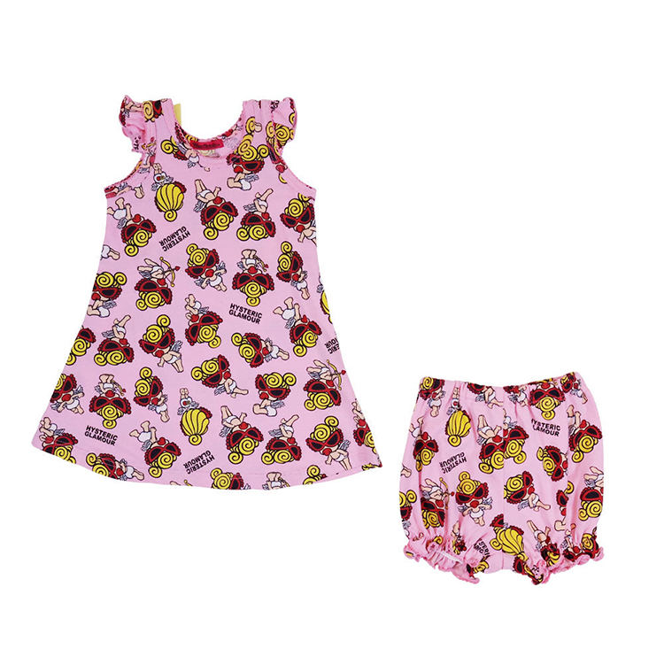 【2026年 春夏新作商品】柔らかいコットン素材使用のチュニックとブルマのセットアイテム。肌触りも良く、着心地バツグン。肩のラインからストンと広がるAラインのシルエットが可愛い。キュートなANGEL MINIの総柄で優しい印象を与えてくれます。肩部分のフリルもしっかりと立って立体感があります。ベビー・キッズサイズのみ。                          ★クロネコゆうパケット指定不可