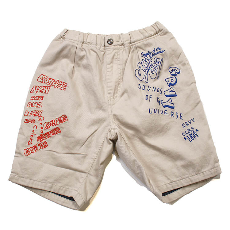 【2026年 春夏新作商品】ツイル素材使用のショートパンツ。肌触りも良く、履き心地バツグン。何でも合わせやすいGROOVY定番型。1タックでお尻周りは少しゆったりとしたシルエット。ヒザが隠れるくらいの5分丈。前後にグラフィティ刺しゅうがポイント。全面に施された刺しゅうでストリート感と可愛さを感じるアイテムです。                           ★クロネコゆうパケット指定不可